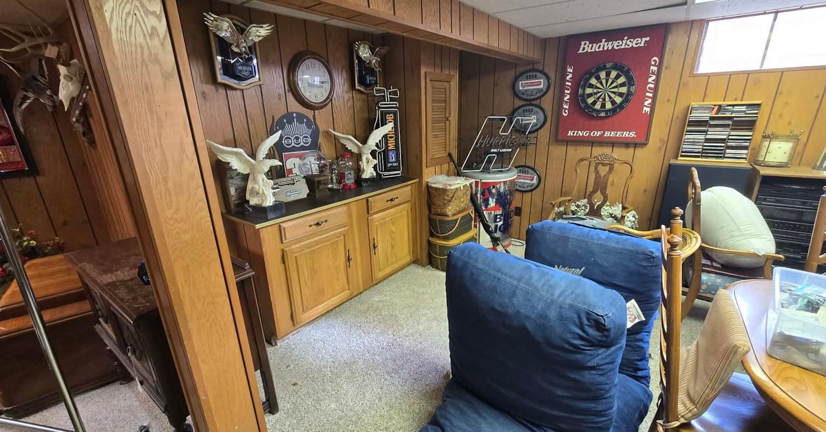 A finished basement recreation room with warm wood paneling on walls and ceiling. Features include mounted deer heads and antlers, Budweiser beer signs, dartboard, shelves displaying figurines, bottles, and collectibles, a bar area with stools, blue bean bag chairs, wooden table and chairs, and various rustic decor elements creating a classic man cave atmosphere.
