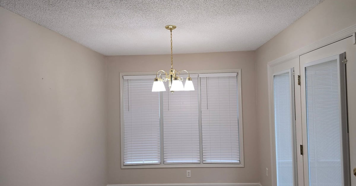 A spacious, empty dining room featuring a textured popcorn ceiling, elegant gold chandelier with four bulb fixtures, light beige walls, large triple window covered with white horizontal blinds, and glass-paneled French doors. The room is well-lit, spotless, and appears freshly restored with no signs of damage or ongoing work.