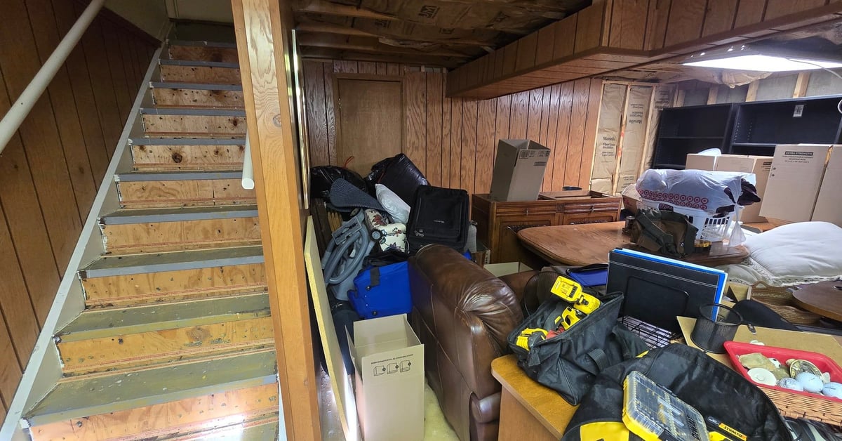 A cluttered unfinished basement with wooden paneled walls, exposed wooden beams and pink insulation on the ceiling. A wooden staircase with railing descends from the left side. The floor space is filled with household items including a brown leather armchair, wooden desk cluttered with tools like a yellow drill and cases, multiple cardboard boxes, blue plastic bins, black garbage bags, pillows, baskets, and scattered debris. Fluorescent lighting illuminates the area, suggesting preparation for cleanup or restoration.
