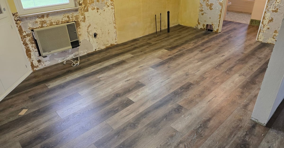 A room undergoing restoration shows severely damaged walls with peeling yellowed plaster and exposed wooden studs, particularly around a window-mounted air conditioning unit. Freshly installed dark laminate flooring with a wood-grain pattern covers the entire floor. An open doorway reveals an adjacent bathroom featuring a white bathtub and tiled walls. Two metal poles stand in one corner, and minor debris is present, indicating active renovation work likely due to prior water damage.