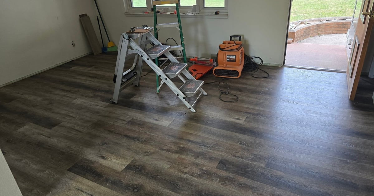 Spacious empty room during restoration work, featuring freshly installed gray luxury vinyl plank (LVP) flooring throughout. An orange commercial air mover/dehumidifier is plugged in and operating in one corner, with orange extension cords nearby. Two aluminum ladders—one extended and one folded—are leaning against the wall, along with a broom, cardboard sheet, and minor wall patch. White walls, large window with view of grass outside, open door showing red truck parked on gravel driveway. Clean, well-lit space with visible electrical outlets and switch plate.
