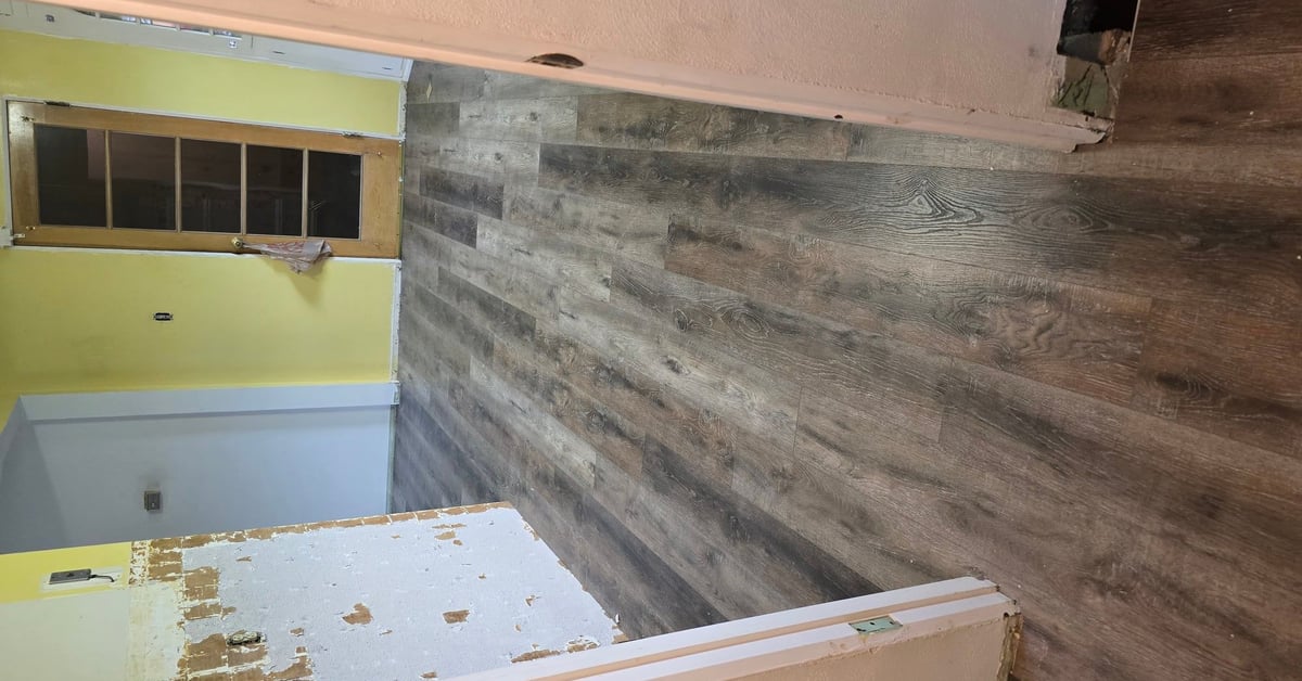Overhead view into a basement area during renovation, featuring partially installed dark wood-grain laminate or vinyl plank flooring covering most of the floor space. Yellow painted drywall walls on both sides, an open wooden door with glass panels, a white bathtub or shower enclosure in the corner, exposed subfloor in patches, minor debris, and construction edges visible. Suggests water damage restoration with flooring replacement underway.